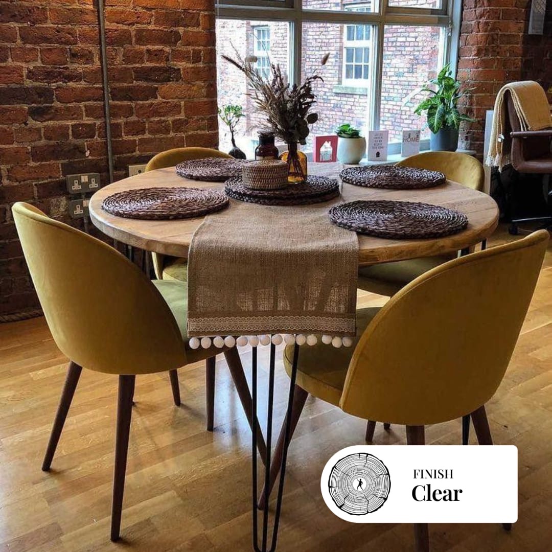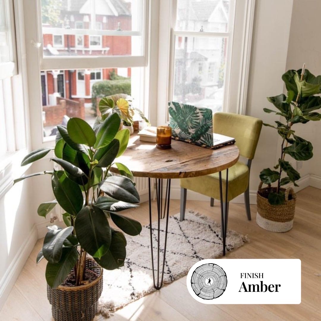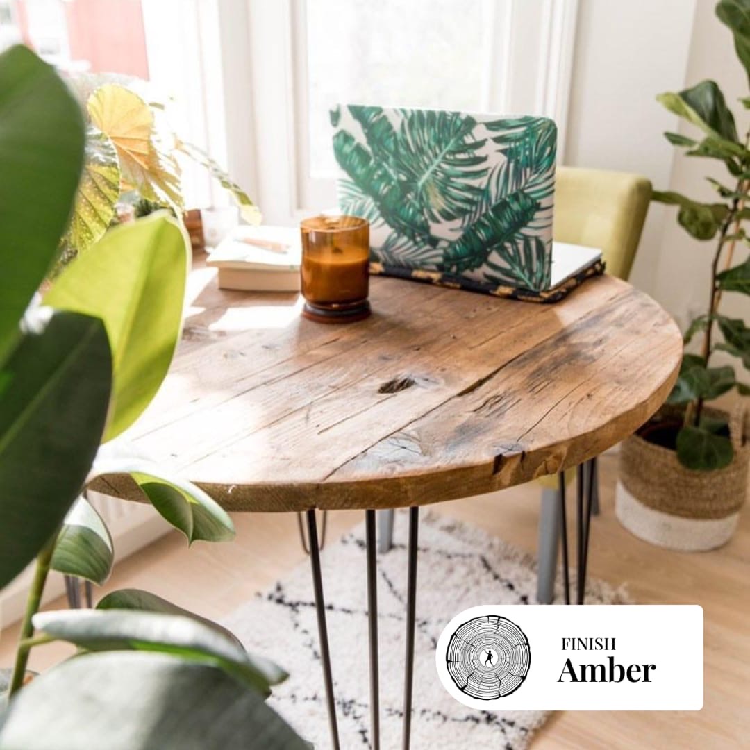 Pictures of the example pieces may slightly vary, as each piece of reclaimed wood is different and reacts differently to stains/oils. The time of the year also has an effect on the woods natural colour too. The finish in the first picture is the Amber stain and the table is 120cm in diameter.