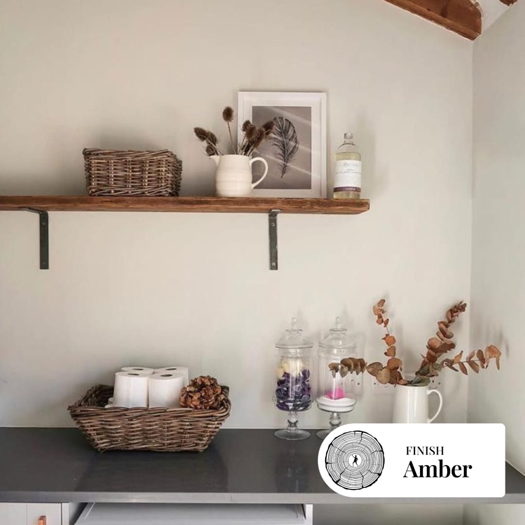 Rustic reclaimed wood shelves bursting with character. Each piece is individually unique and available in a variety of finishes. Includes raw steel brackets (fixings not included) Brackets supplied but will be unattached on delivery to make it safer logistically. Handmade to order.